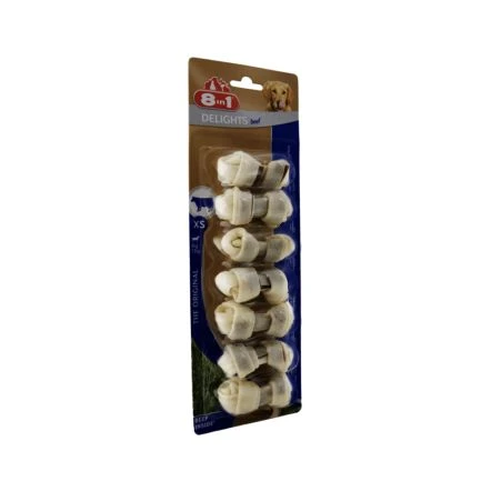 8in1 Delights Beef L is a chewy bone containing only one source of protein (beef) – with delicious beef wrapped inside tough rawhide for your dog’s enjoyment, recommended for dogs weighing over 20kg. This tasty rawhide and chicken combination will keep your dog happily busy and ensure intensive, long lasting chewing fun to enhance dental care. 8in1 Delights products help to satisfy dogs’ natural instinct to chew and exercise their jaw muscles. This chew helps to reduce tartar and plaque build-up as your dog will be encouraged to keep chewing until the very last bite to reach the meat in the middle. With up to 60 minutes of chewing time, this product will provide a satisfying chew experience for your dog and keep them occupied. It is the perfect match of chewing fun and a dog treat, ideal for in between your dog’s meals and to fight against boredom. Additionally, this chew is low in fat and free from artificial colours and flavours. Keep your dog happy with the 8in1 Delights Beef Bones.