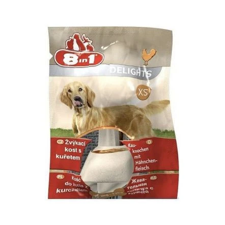 8in1 Delights XS are chewy bones with delicious chicken meat wrapped inside tough rawhide for your dog’s enjoyment, recommended for dogs weighing between 2-12kg. This tasty rawhide and chicken combination will keep your dog happily busy and ensure intensive, long lasting chewing fun to enhance dental care. 8in1 Delights products help to satisfy dogs’ natural instinct to chew and exercise their jaw muscles. This chew helps to reduce tartar and plaque build-up as your dog will be encouraged to keep chewing until the very last bite to reach the meat in the middle. With up to 60 minutes of chewing time, this product will provide a satisfying chew experience for your dog and keep them occupied. It is the perfect match of chewing fun and a dog treat, ideal for in between your dog’s meals and to fight against boredom. Additionally, this chew is low in fat and free from artificial colours and flavours. Keep your dog happy with the 8in1 Delights Bones.