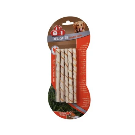 8in1 Delights Twisted Sticks are delectable twisted chews made of delicious chicken meat wrapped in tough rawhide, recommended for dogs weighing between 2-12kg. Due to their special shape, this tasty rawhide and chicken combination will keep your dog happily busy and provide intensive, long lasting chewing fun primarily for smaller dogs with a less powerful bite. 8in1 Delights products help to satisfy dogs’ natural instinct to chew and exercise their jaw muscles. These sticks help to reduce tartar and plaque build-up as your dog will be encouraged to keep chewing until the very last bite to reach the meat in the middle. These chews will support the optimal dental care of small breeds such as Chihuahuas, miniature poodles, etc. With up to 60 minutes of chewing time, this product will provide a satisfying chew experience for your dog and keep them occupied. It is the perfect match of chewing fun and a dog treat, ideal for in between your dog’s meals and to fight against boredom. Additionally, these sticks are low in fat and free from artificial colours and flavours. Keep your dog happy with the 8in1 Delights Twisted Sticks.