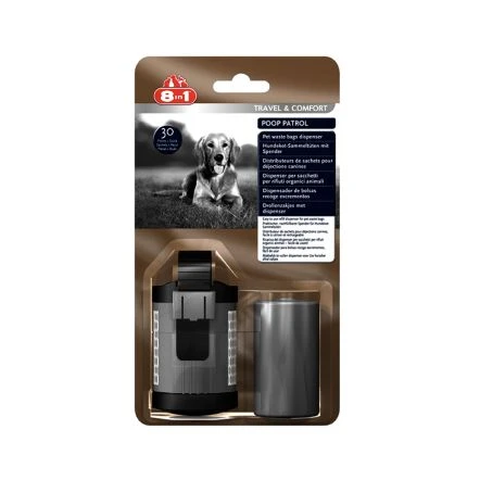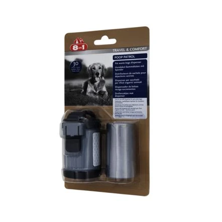 8in1 Poop Patrol bags are tear proof bags for dog poop which come in a handy dispenser. They are perfect when on the move, making it easier for you to dispose of your dog’s poop properly while out walking or on a journey and to keep the environment clean for people and animals. The dispenser guarantees one bag at a time, is fitted with an adjustable rubber strap and fits to any lead. The reflectors on both sides also offer additional protection when walking in the dark.