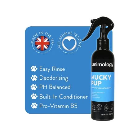 Mucky Pup is a mild no-rinse puppy shampoo spray that helps to effectively remove dirt and odour from your puppy’s coat. Ideal for use as a ‘spot cleaner’, the spray is great for use on the go or for a quick clean between washes. Simply spray it on your puppy’s coat and groom it through. All Animology leave-in dog sprays are vitamin and conditioner enriched to help maintain the health, strength and condition of your dog’s coat. Each spray is also deodorising, helping to keep your dog’s coat fresher for longer between washes. The Animology no-rinse shampoo sprays are a great way to help keep your dog clean between washes, effectively loosening dirt, helping to keep your dog clean and fresh.