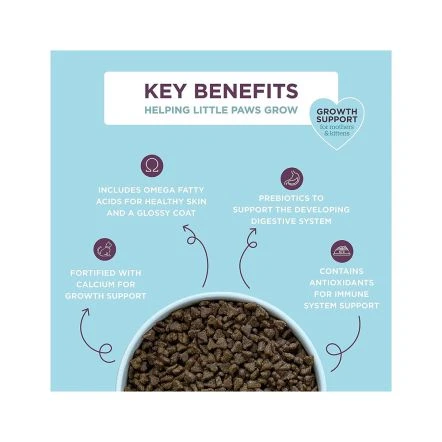 Composition: Chicken 43% (Chicken meal 27%, Chicken fat 10%, Hydrolysed poultry powder 3%, Chicken digest 3%), Rice, Maize, Wheat, Maize gluten, Unmolassed beet pulp (3%), Brewer’s yeast, Soya bean meal*, Fish meal (1%), Egg (1%), Short chain fructo-oligosaccharides (0.4%), Potassium chloride, High nucleotide yeast (0.12%), Salt.
