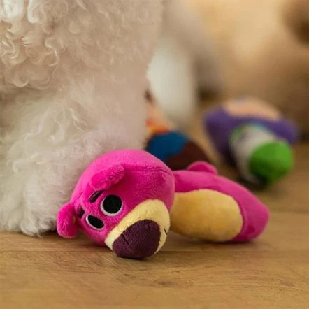 “Ooohhh…All that cuteness on stick, and most importantly it squeaks! Featuring one of the most iconic pixar characters, Toy Story’s Lotso as a plush, it will provide all the fun your pooch needs! Plush stick toy inspired from Disney Toy Story Characters. Soft polyester material. Contains squeaker that stimulate your dog’s curiousity. Perfect size for dog to play and bite. Spot clean only.”