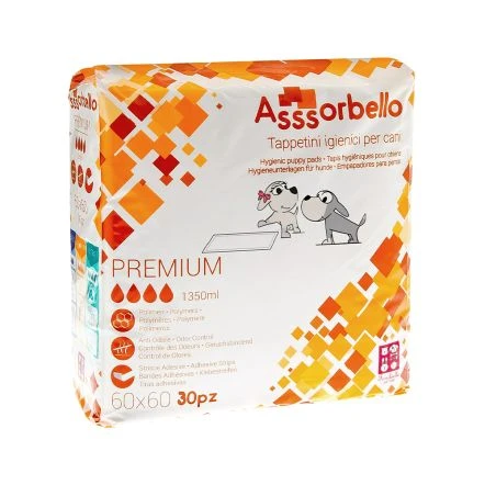 The Asssorbello Premium hygienic pads have an outstanding absorbency capacity up to 1350 ml thanks to the active polymers, in a few seconds they turn into gel, keeping the top layer clean and dry for a long time, capturing odors. The layer in contact with the floor is 100% waterproof and with the addition of the adhesives at the 4 corners it can be fixed quickly and easily. The Asssorbello hygienic pad is ideal for puppies, elderly dogs and dogs with incontinence problems; functional even in the car to prevent wet paws from dirtying the car during rainy days and to keep dog bed and cat litter box clean.