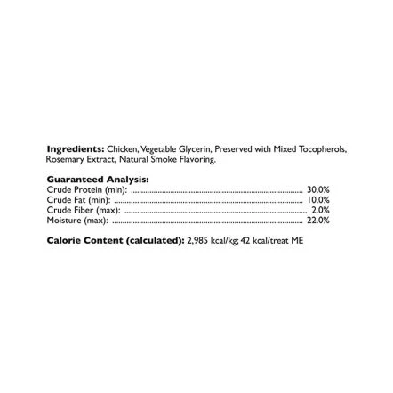 Chicken, Vegetable Glycerin, Preserved with Mixed Tocopherols, Rosemary Extract, Natural Smoke Flavoring.