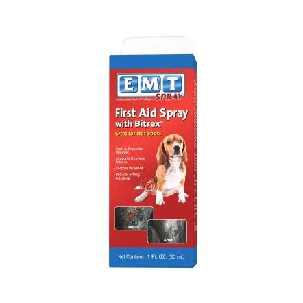 - EMT Spray Contains Hydrolysate of Collagen with Bitrex® – First Aid Spray for Dogs soothes, seals and protects wounds to support the healing process.