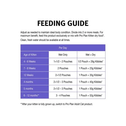 Adjust as needed to maintain ideal body condition. Divide into 2 or more meals. For maximum benefit, feed this product exclusively or mix with Pro Plan Kitten dry food*. Clean, fresh water should be available at all times.