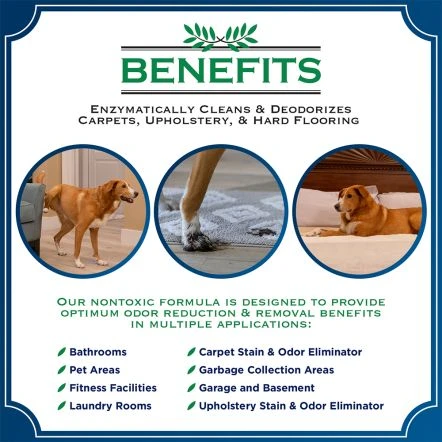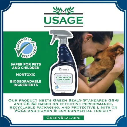Richard’s Stain & Odor powerful dual-action enzyme formula naturally captures and destroys the odors immediately while also providing long-lasting, deep cleaning benefits with biotechnology. Our formula is Green Seal Certified*, so it is safer for pets and children, nontoxic and has biodegradable ingredients.