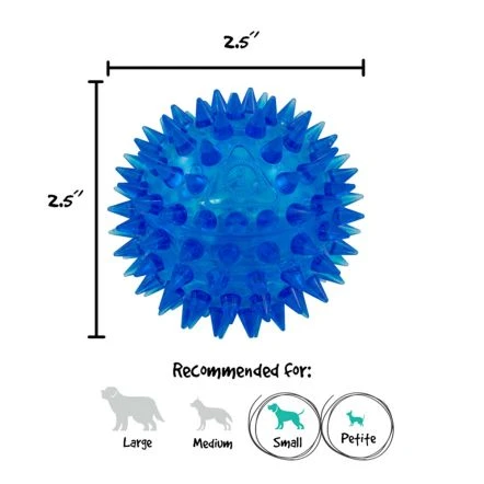 Every dog plays differently, since not all toys are created equal, it’s always best to keep a close watch on your pup in case things get too ruff. Supervised play will help toys last longer and most importantly keep your pal safe. No dog toy is truly indestructible, so always remove the toy from playtime if pieces begin to break off. Assorted colors. 2.5″ diameter. For small dogs.This fun-shaped toy features a unique spiky texture that can stand up to extra-tough rounds of fetch, but it’s soft and gentle on doggy gums, even for teething puppies. Since it’s made out of food-grade, BPA-free TPR rubber, it’s safe, non-toxic and perfect for everyday play in the yard, at home, or at the park! Plus, they come in an assortment of bright colors and different sizes to suit your pal’s size and bite.