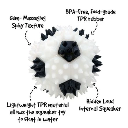 Score a goal with this fun spikey soccer ball! Gnawsome Squeaker Balls feature a loud internal squeaker, and a unique gum-massaging spikey texture! Made from food-grade, BPA-free TPR material.