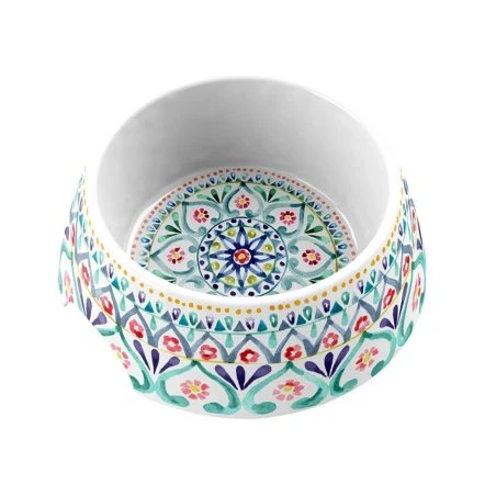The Boho Medallion Pet Bowl in looks and feels like ceramic without the weight and breakability. Functional for everyday and indoor/outdoor use. 3D technology. 100% BPA Free. Glazed finishes with hand-painted looks coated in food-safe LG coating. Holds 2.5 cups of food.