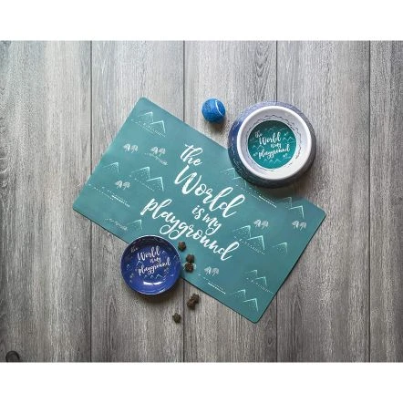 The world is their playground. Their pet mats are made of PVC and cushioned Eva making it easy for clean up on those sometimes spills and splashes. Large enough to fit 2 bowls and great for indoor or outdoor use. Please note that the pet bowls shown in the second photo is only for reference and are not included when purchasing this product.