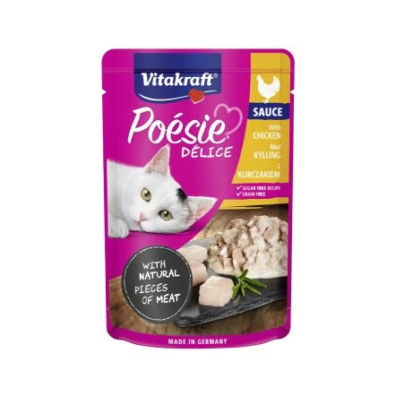 Delicious wet food for adult cats, delicate chicken fillet in an exquisite sauce. A real poetry of a unique taste for a cat. The food contains natural, high-quality pieces of meat for even greater pleasure in eating. The best ingredients guarantee the highest quality and meet all your cat’s nutritional needs. A delicacy for real tigers.