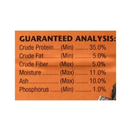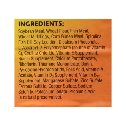 IngredientsSoybean Meal, Wheat Flour, Fish Meal, Wheat Mill Run, Corn Gluten Meal, Fish Oil, Dicalcium Phosphate, Kale, Lecithin, Bentonite, Calcium Carbonate, Dried Kelp, L-Lysine, L-Ascorbyl-2-Polyphosphate (source of stabilized Vitamin C), Choline Chloride, Vitamin E Supplement, Niacin Supplement, d-Calcium Pantothenate, Riboflavin Supplement, Thiamine Mononitrate, Biotin, Pyridoxine Hydrochloride, Folic Acid, Vitamin A Supplement, Vitamin D3 Supplement, Vitamin B12 Supplement, Manganese Sulfate, Zinc Sulfate, Ferrous Sulfate, Copper Sulfate, Sodium Selenite, Potassium Iodate, Propionic Acid (preservative).